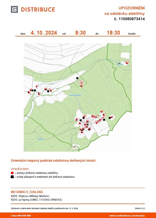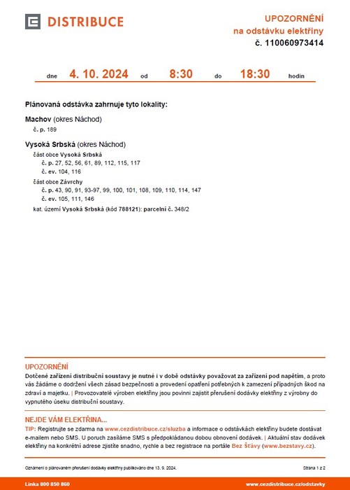 Úvod > Obec > Aktuality > Oznámení o přerušení dodávky elektrické energie dne 4. 10. 2024