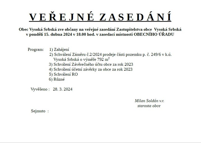 Úvod > Obec > Aktuality > Pozvánka na veřejné zasedání Zastupitelstva obce 15. 04. 2024