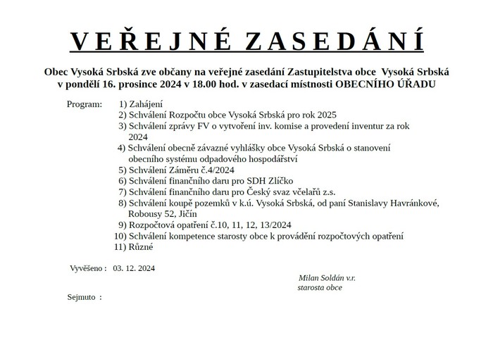 Úvod > Obec > Aktuality > Pozvánka na veřejné zasedání Zastupitelstva obce 16. 12. 2024