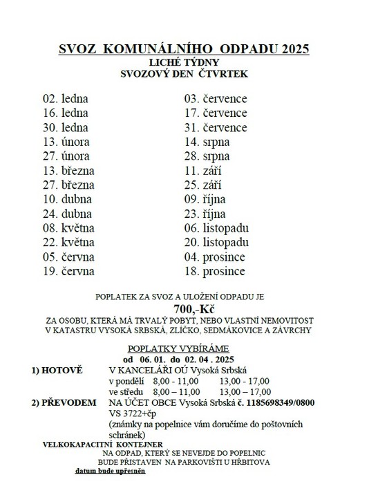 Úvod > Obec > Aktuality > SVOZ KOMUNÁLNÍHO ODPADU NA ROK 2025